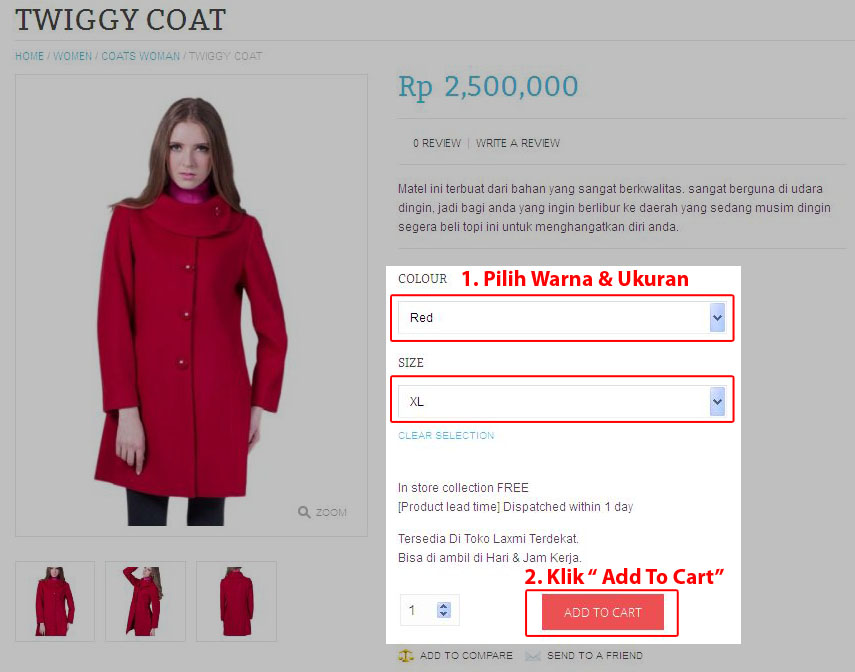 2. Pilih Ukuran dan Warna yang tersedia kemudia Klik ” Add to Cart”